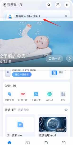 3、点击邀请家人加入设备选项,还展示了一键备份功能及最近打开、备份文件,方便管理资料。
