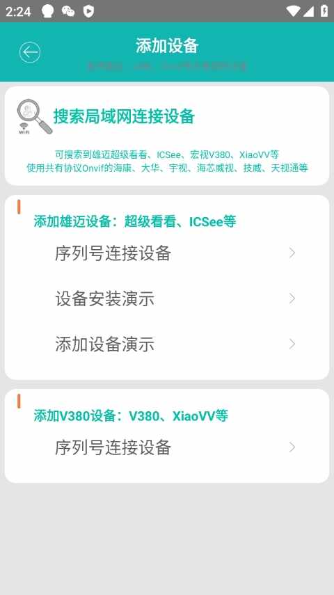 2.添加“搜索、连接摄像头”功能,可搜索到雄迈超级看看、ICSee、宏视V380、XiaoVV等,支持实时视频、双向对讲、视频截图、监控录像查看、下载等