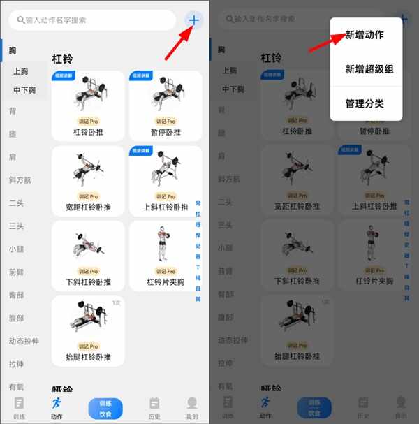 2、打开锻炼动作,用户可以看到很多不同的运动动作,点击右上角“+”,下拉里选择新增动作;