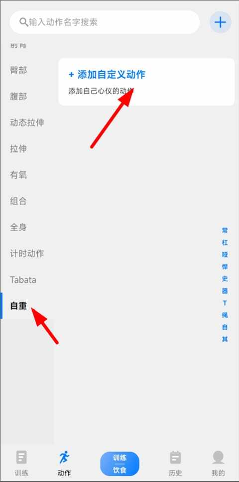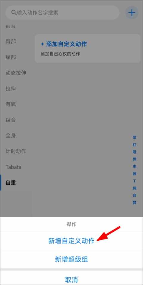4、在动作页面中左侧肌肉部位栏下拉至自重,点击添加自定义动作;