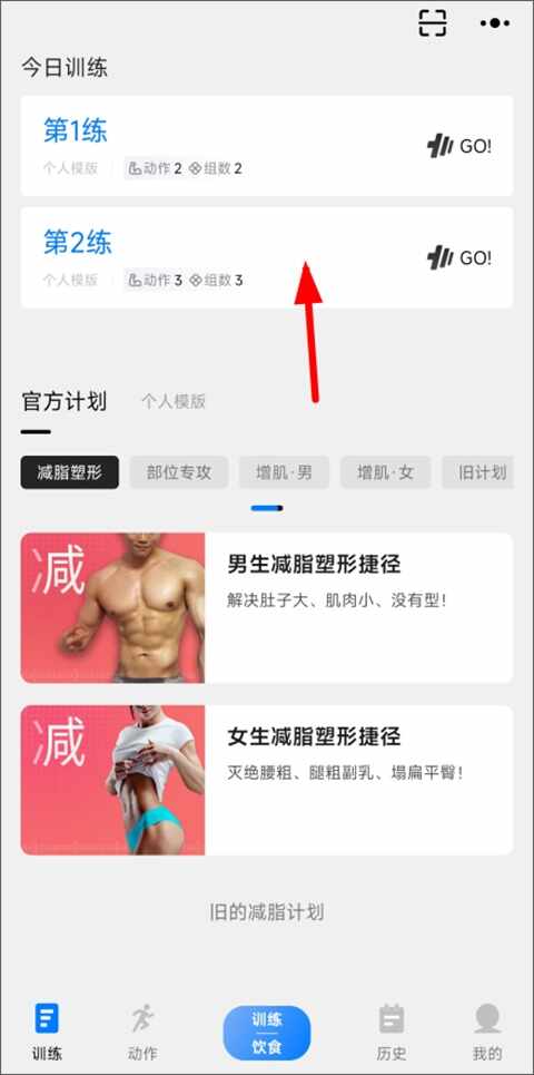 1、用户打开训记app,登录进入训练首页,在首页用户可查看官方不同的训练计划和个人模板,点击训练;