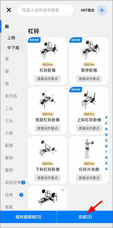 4、打开动作添加页面,用户根据自己锻炼的需要,选择合适的锻炼动作,点击完成;