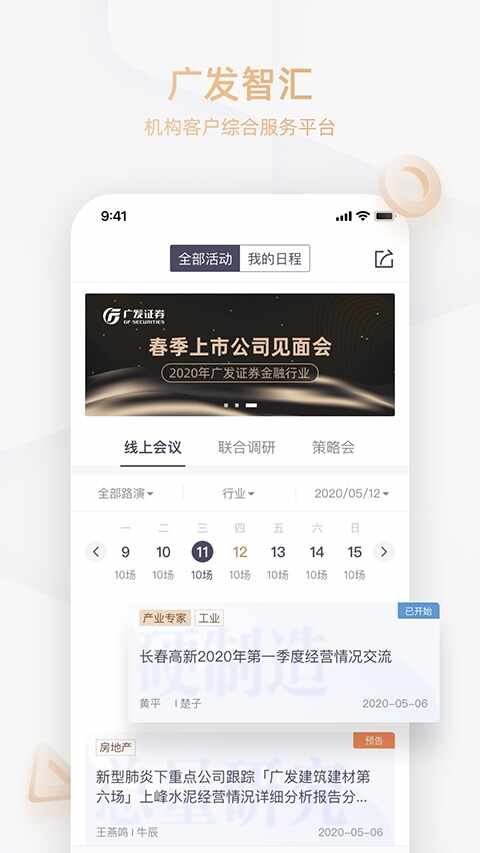 广发研究中心多地活动在线查看,一键报名,包括线上会议、调研活动、大型策略会及直播回放等精彩活动尽在广发智汇,满足客户各种使用场景