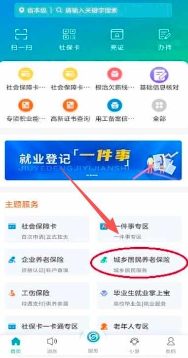 3、登录成功进(jin)入首頁,可看到就业登记一件事等主题棴務,按需选社保卡、养老保险等业务办理。