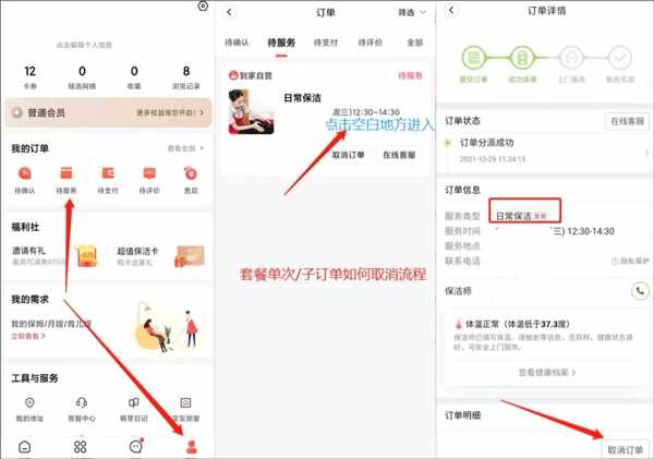1、您好,如是某单次订单取消:您可在APP-我的﹣待服务﹣点击需取消的订单﹣操作取消;
