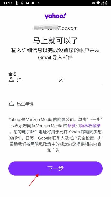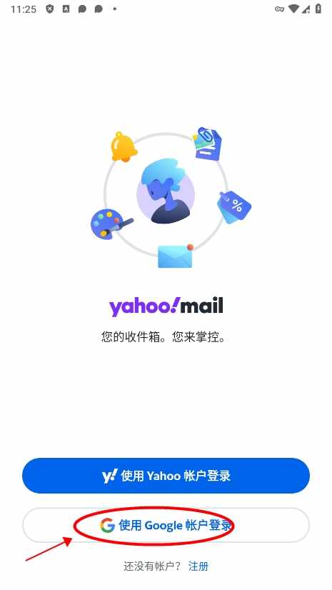 1、进入雅虎邮箱app,支持yahoo账户登录和google账户登录,如果没有账户,点击注册;