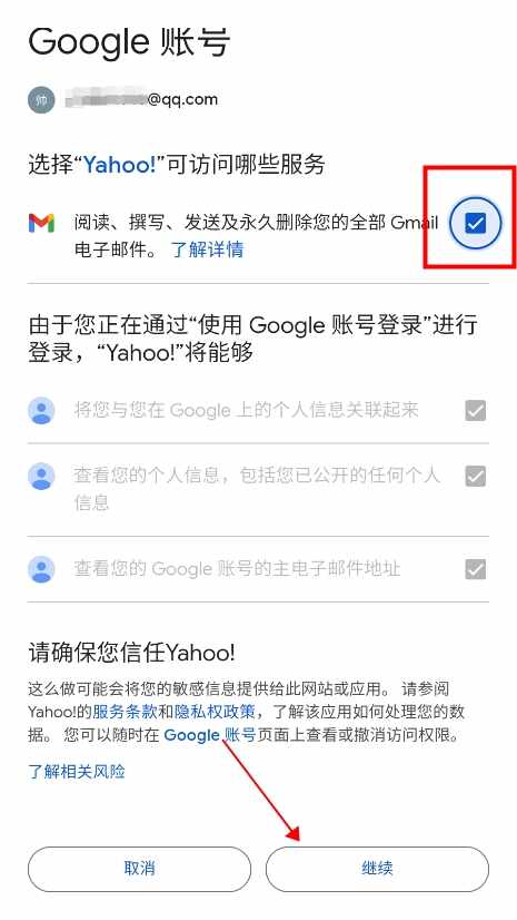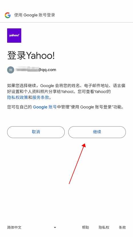 5、弹出登录yahoo提示,点击继续;