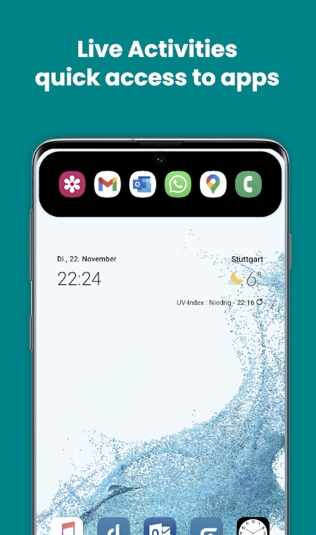其主要功能包括天气、时间、倒计时等实用信息展示。它模仿了苹果iPhone 14 Pro系列中的iOS 16“灵动岛”UI设计,让安卓用户也能体验到类似的功能。