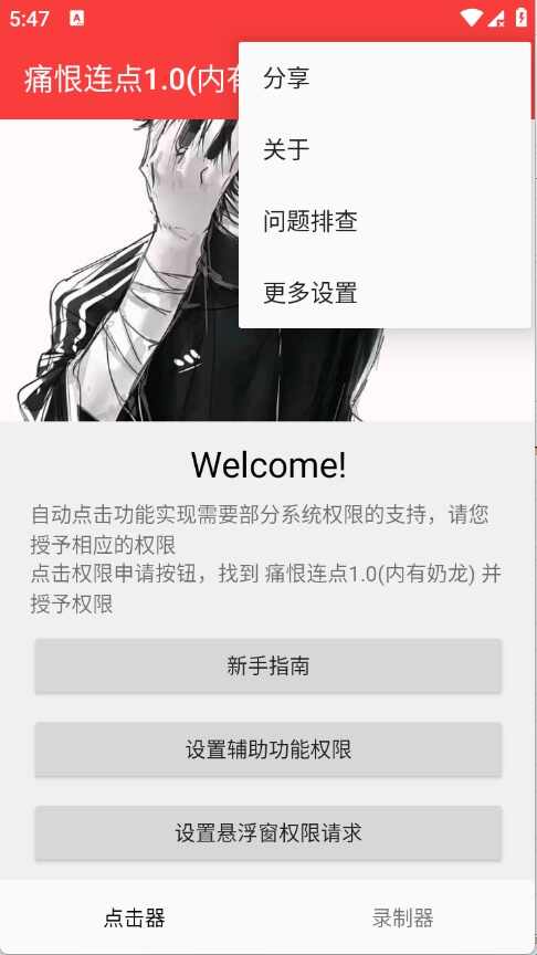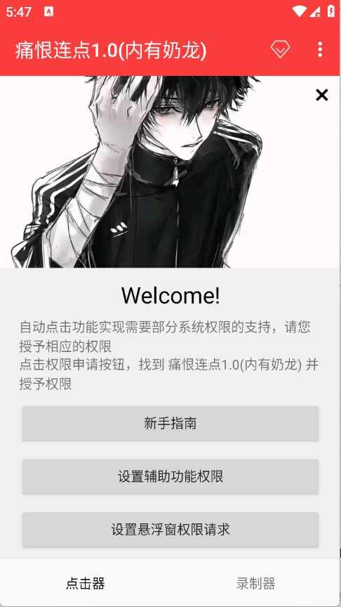 1、下载安装痛恨连点器应用,打开软件进入主界面了解功能概览。
