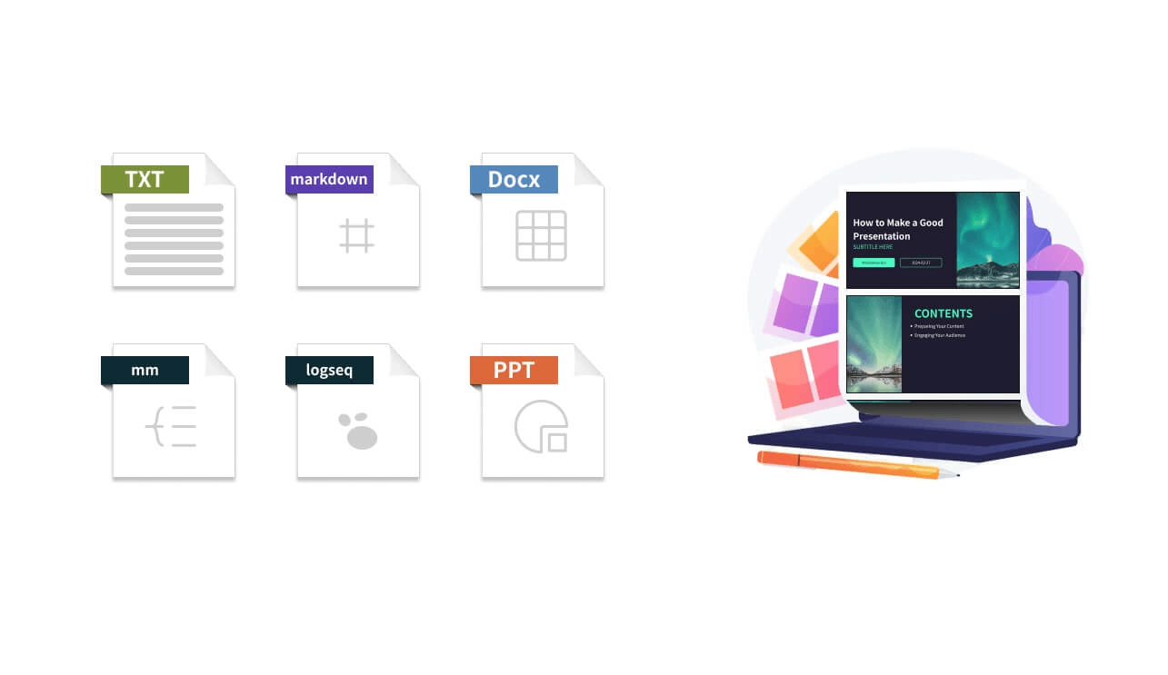 4、该软件可(ke)以将现有文件直接(jie)输入到 PPT中,并支持 Markdown, Word等。