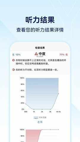 听力结果,展示检查以后的听力结果,可以直观的知道左右耳的听力数(shu)据(ju)