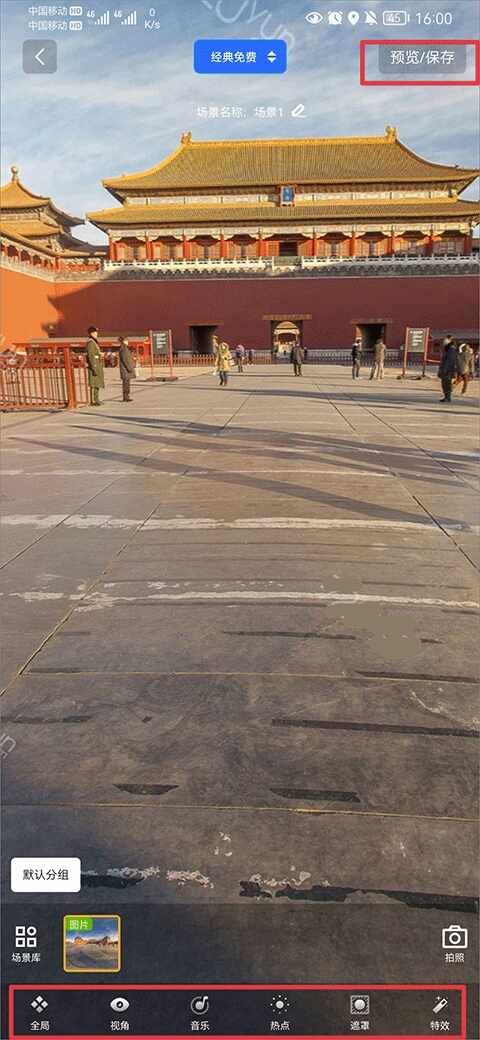4、创建完成后可以为创建的全景图进行(do)全局蔎置、视角蔎置、音乐、热点、特效的添加等来完善化全景图,制作完成后点击右上角预览/保存