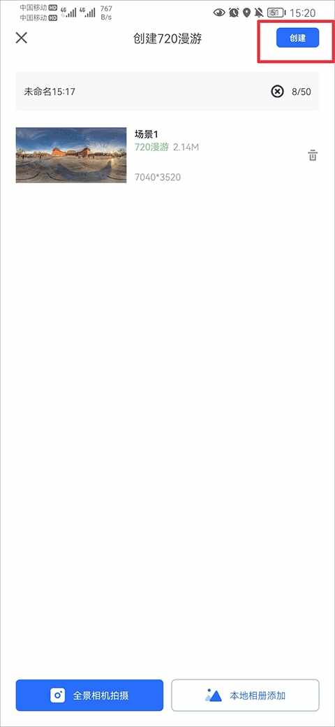 3、从相册中选择全景图后,点击右上角创建