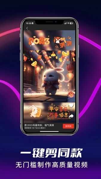 1.剪同款:一键选择素材(cai),轻松创(chuang)作(zuo)与您喜爱的同款风格视频,让您的视频与潮流保持一致。