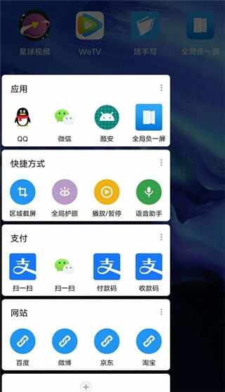 3、当你开启全局负一屏之后,手机桌面会出现一个区域很小的(small)悬浮按钮,點击它即可打开全局负一屏的菜单信息栏,里面有应用、快捷方式、支付、网站4个栏目,支付目前只支持微信和支付宝的快捷支付方式,需要用到时,直接點击就能快速直达付款界面,而不用一步一步进入应用程序操作,非常方便。