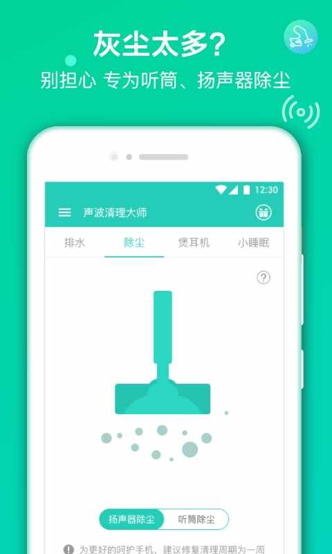 手机的扬声器会吸附很多的灰尘和铁粉,进而导致扬声器声音小,严重的会出现爆音,甚至没有声音。声波清理大师利用共振原理,使灰尘振动脱离扬声器,从而达到清尘的效果。