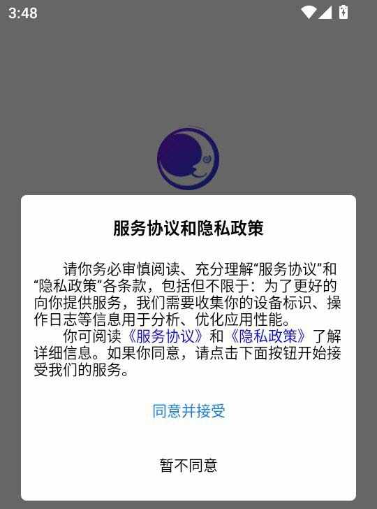 1.首先打开软件阅读协议和隐私政策后,点击“同意并接受”按鈕进入APP