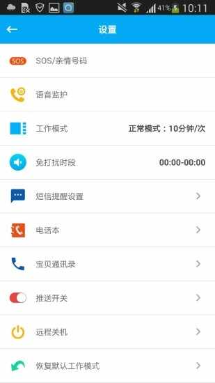 10、设置: APP可以设置 SOS/亲情号码,设备工作模式,监护号码,免打扰模式等