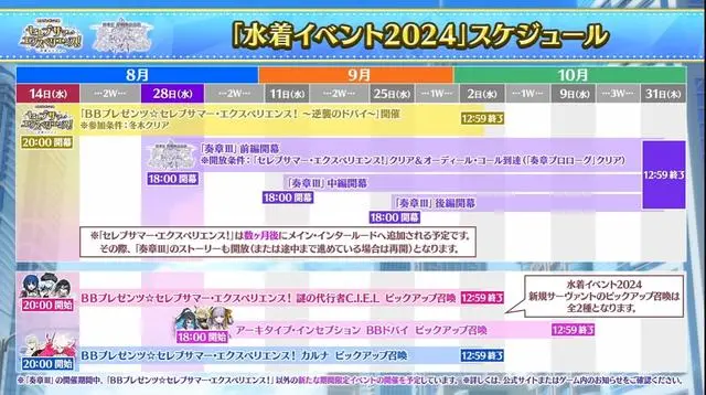 FGO日服泳装9期和奏章3期间开启活动一览当然这两个(ge)半月的时间(jian)也不都是只开启这两个(ge)活动,在上图的最底下还标注了一句话“在奏章3开启期间,除了泳装9期之外,还会有新的限定活动开启”。