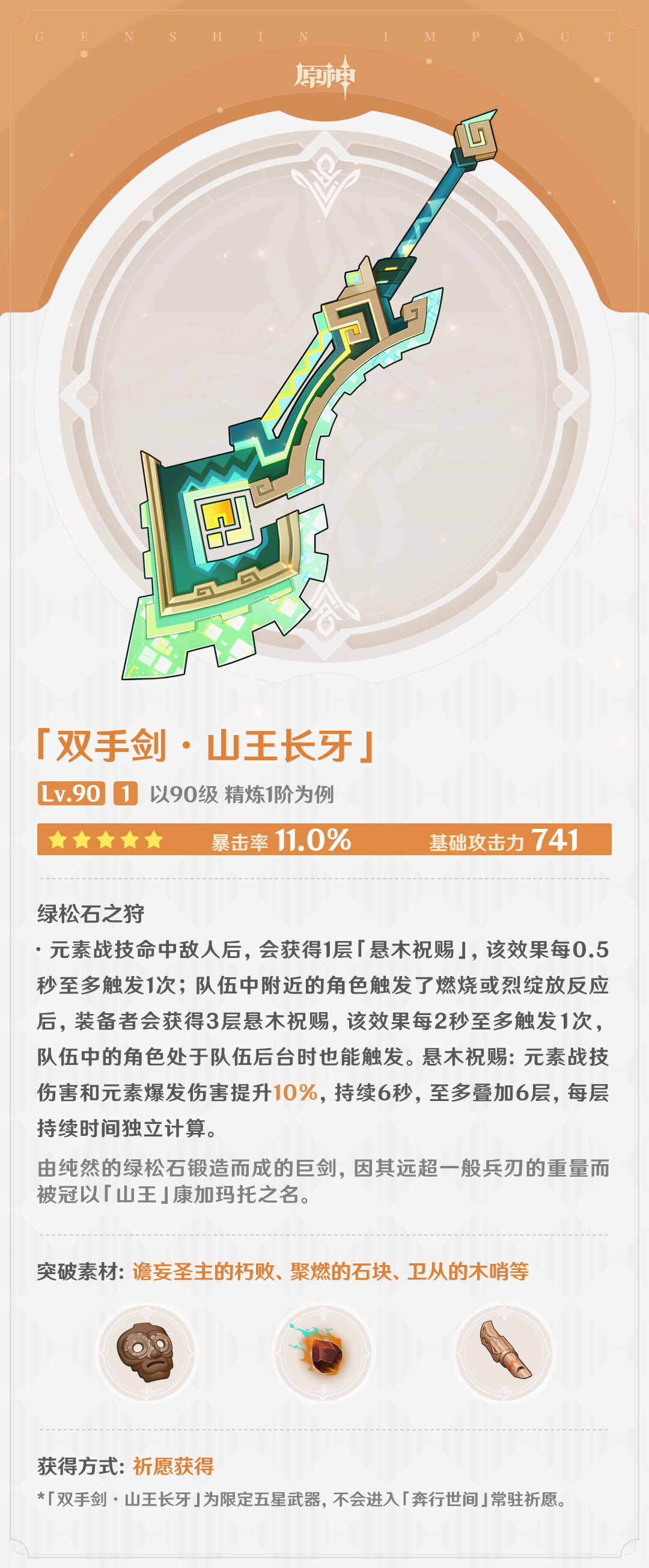 *「双(shuang)手剑·山王长牙」为限定五星武器(wuqi),不会進入「奔行世间」常驻祈愿。