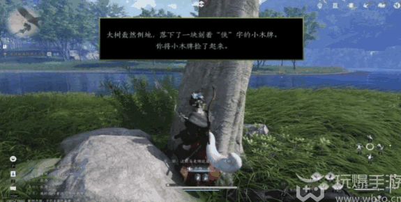 2、接着就需要砍倒最粗的那颗大树,就能取得侠字小木牌,把木牌捡起来。