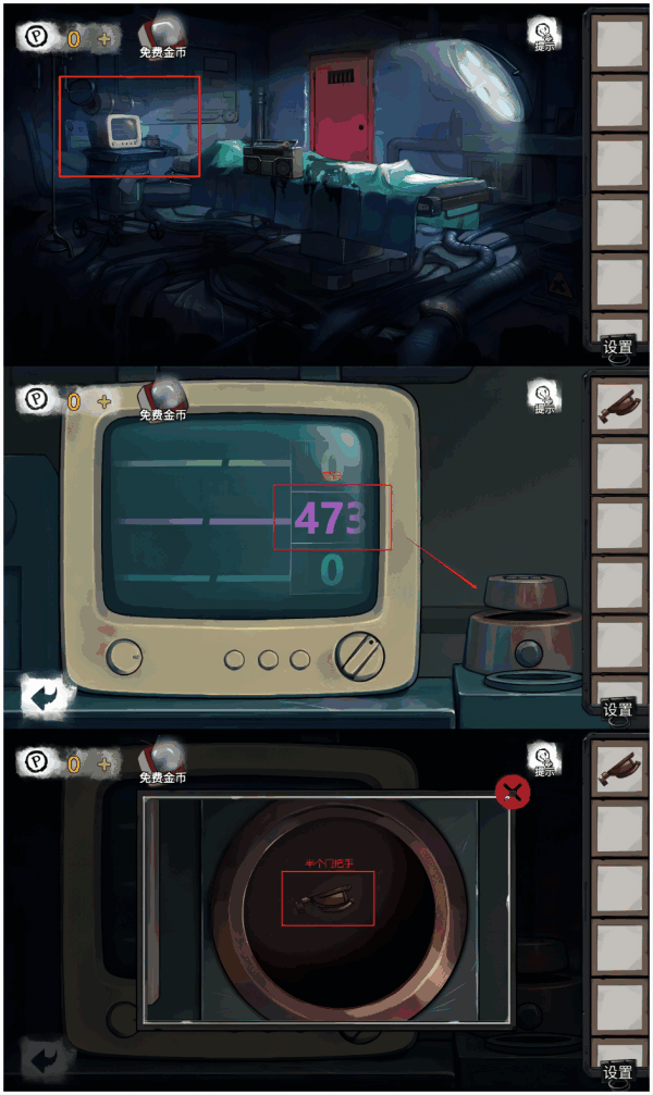 房(fang)间一:治疗室点击(ji)监护仪,看到密码【473】,点击(ji)右下角【按钮】,输入密码,得到【半个门把手】2。