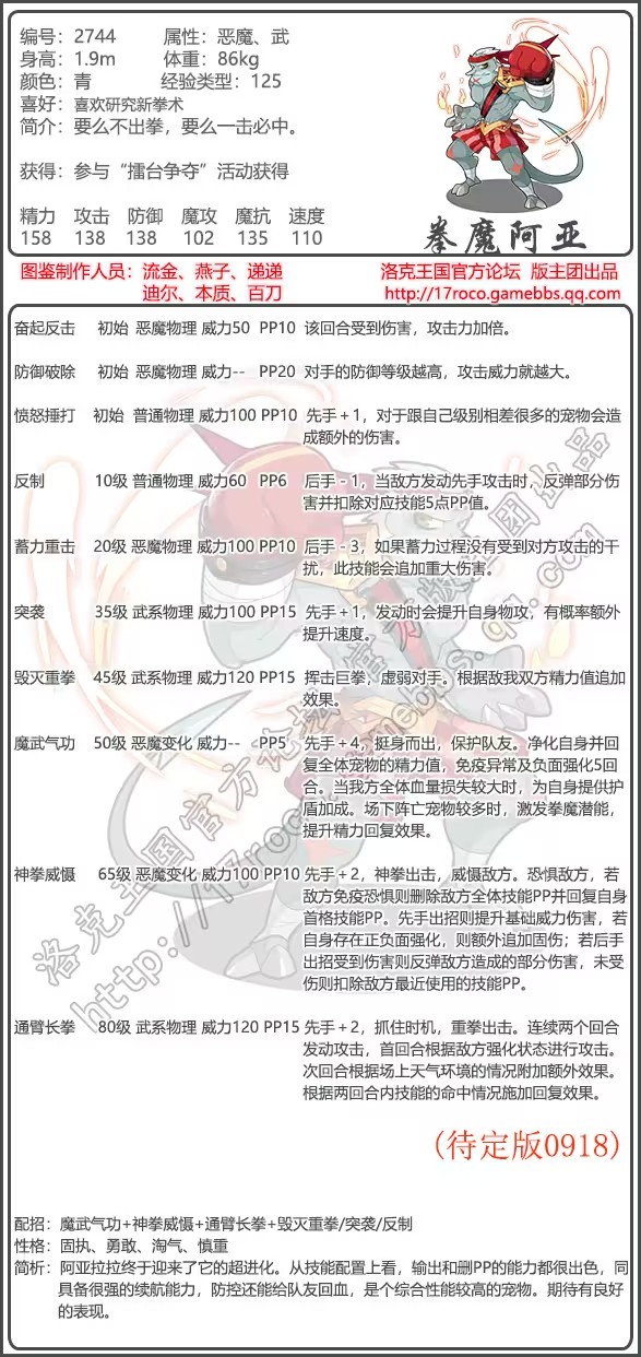 洛克王国拳魔阿亚技能搭配配招:魔武气功+神拳威慑+通臂长拳+毀滅重拳/突袭/反制