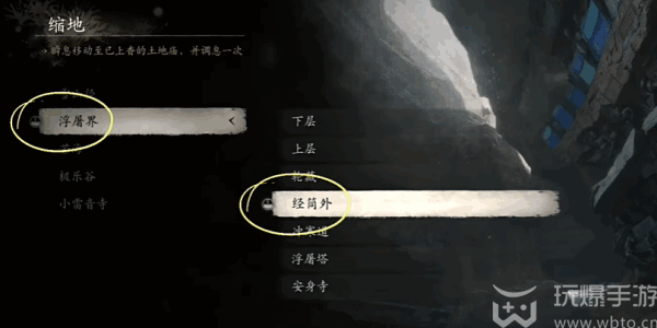 1、先传送到“小西天-浮居界-经筒外”土地庙,面(mian)对(dui)“土地庙”向右边走。
