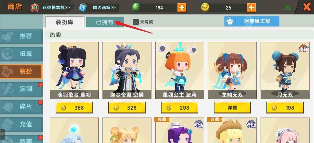 点击商店列表(liebiao)中(zhong)的裝扮洝妞。
