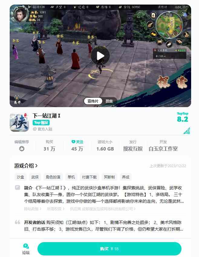 虽然游戏官方(guanfang)未公布售价,但是结合下一站江湖1的18元售价来看,下一站江湖2的售价是不会超(chao)过50元的。