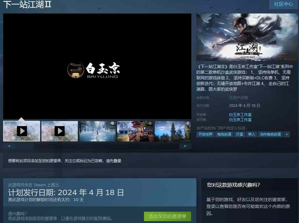 下一站江湖2售价介绍答:截止2024年4月7日,下一站江湖2暂未公布游戏的售价,预计售价为50元以内(不含dlc)。