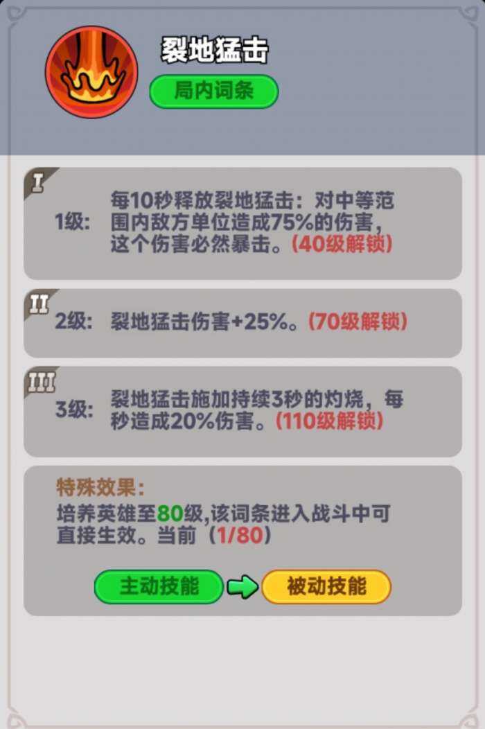 三技能:裂地猛击,主动战法,每10秒释倣一次技能,造成范围伤害,不过该伤害能造成暴击,伤害效果极高,而(er)且(qie)技能达(da)到(dao)二阶伤害再次1.5倍,不过要70级,诶不对,我为什么要考虑氪佬有没有钱氪的问题。