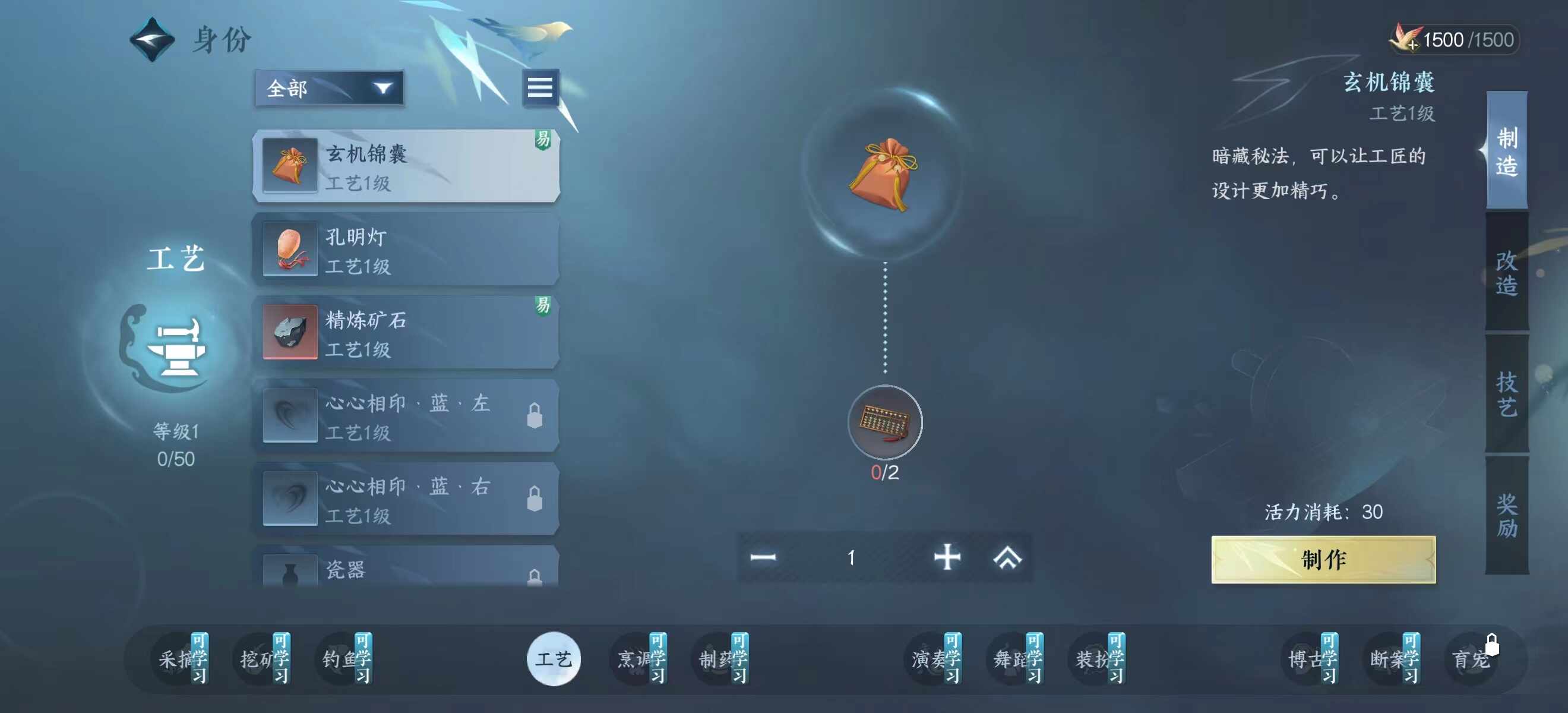 2、玩家要在商城中購買两个【机巧工具组】,然后在身份中选择(hoose)【工艺】;