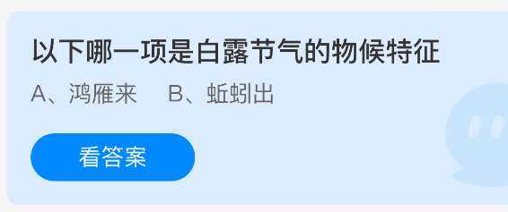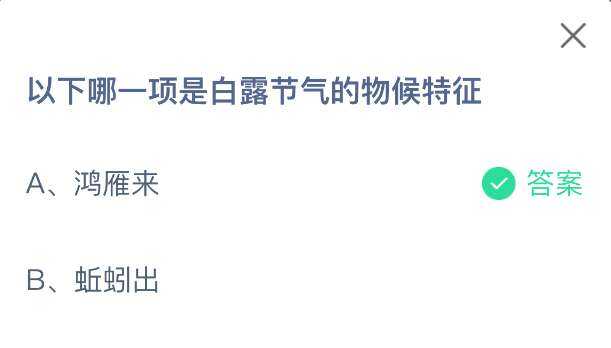 以下哪一项是白露节气的物候特征支付宝里这个小鸡答题超受欢迎的!只要攒够饲料喂小鸡,就能收获更多鸡蛋,一起为公益助力啦!今日正确答案是【鸿雁来】,鸿雁南飞,元鸟北归,群鸟储食,此乃白露节气特有的物候景象。随着气温逐渐下降,天气转凉,温度变化成为主导物候现象的关键因素。为应对寒冷、适应环境变迁,鸟类纷纷采取相应行为,或迁徙以避寒,或储备食物以度凉季,接下来就是具体内容。