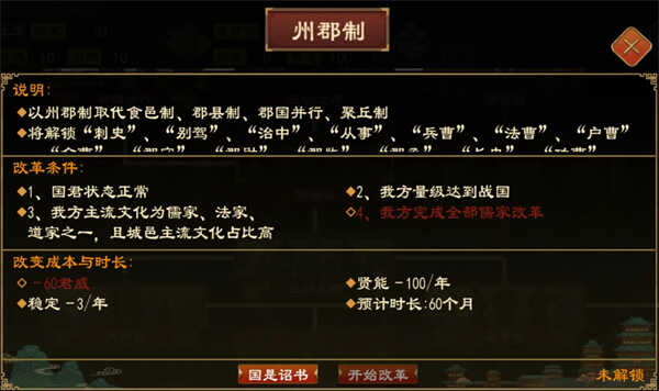 除(chu)了常规的典章国制改革外,在新版本中,进国族阶段(duan)并满足一定条件后,可在(zai)典章国制界面中选(xuan)择(ze)通过国是诏书,消耗(xiaohao)中朝的积累点数进行(do)州郡制、郡县制、郡国并行制改革。通过该项改革路径,可以一定程度上解决进入(ru)国族阶段(duan)后,由于政策固化等原因导致(daozhi)典章国制改革较为繁琐困难(kunnan)的问题。