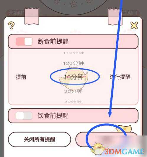 4、筛选“10分(fen)钟”点(dian)击(ji)【保存(save)】按(an)钮(niu)即可(jike)设置断食前提前(tiqian)10分(fen)钟提醒我。