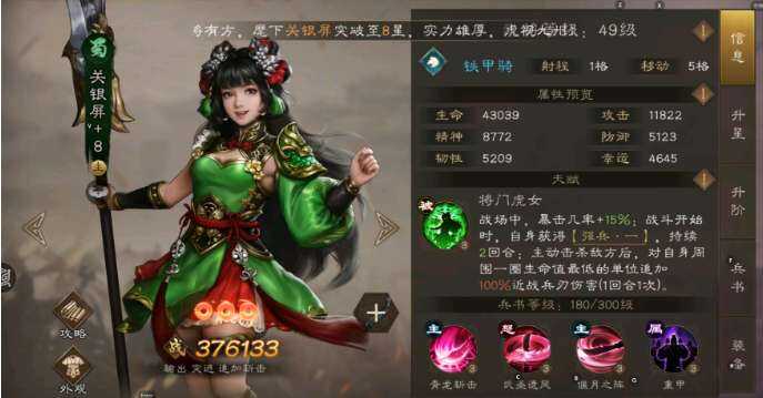 关银屏武力78、运气86,这武力决(jue)定她输出不低,运气高暴击就有保障,天生就适合打输出。她是重骑兵,在战场上能减免6%远程兵刃伤害,在平原地形战斗力还能提升,不过在山地和建筑地形就没加成了,这地形选择上可得注意。