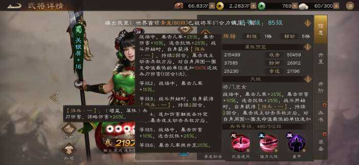 再看看她的技能,“青龙斩击”能对直线3格距离发动冲锋,给路径上第一个敌人造成最高(zuigao)180%近战兵刃伤害,冲锋前还能给自己加个“强兵·一”的增益状态,兵刃伤害和谋略伤害提升20%,持续(xu)2回合,伤害矗帹起飞,用来冲散敌方阵型或者秒掉关键脆皮,效果一流。“武圣遗风”这个(this)技能消(xiao)耗(hao)200怒气,能打出最高(zuigao)220%近战兵刃伤害 ,要是击杀目标,还能对自(zi)身(shen)周围一圈生命值最高(zuigao)的单位造成110%近战兵刃伤害,就算没杀掉目标,武将到6星也能(yeneng)触发追加伤害,残局收割或者打伤害补充,作用极大。还有“偃月之阵”,对目标造成最高(zuigao)185%近战兵刃伤害 ,要是攻击力比目标高,自(zi)身(shen)暴击率能提升到25%,使用范围还能扩大到周围1圈,贴身肉搏的时候,伤害和暴击都有保障。