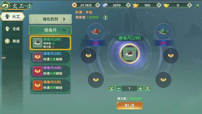 学习火工制造,可制造属性强化(hua)药剂和爆毒丹