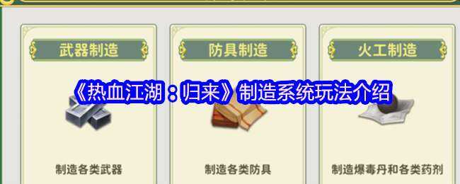 热血江湖:归来制造系统玩法教程在游戏中,少侠们可以拜师学艺,从武器制造、防具制造、火工制造这三大副职业里挑选一个专精,每打造一件道具,都能涨熟练度,手艺越精,能造的神兵利器、极品宝甲、奇门丹药自然就越高、越稀罕。想要亲手打造绝世神兵、锻造无双宝甲、炼制奇门丹药,下面是相关内容介绍。
