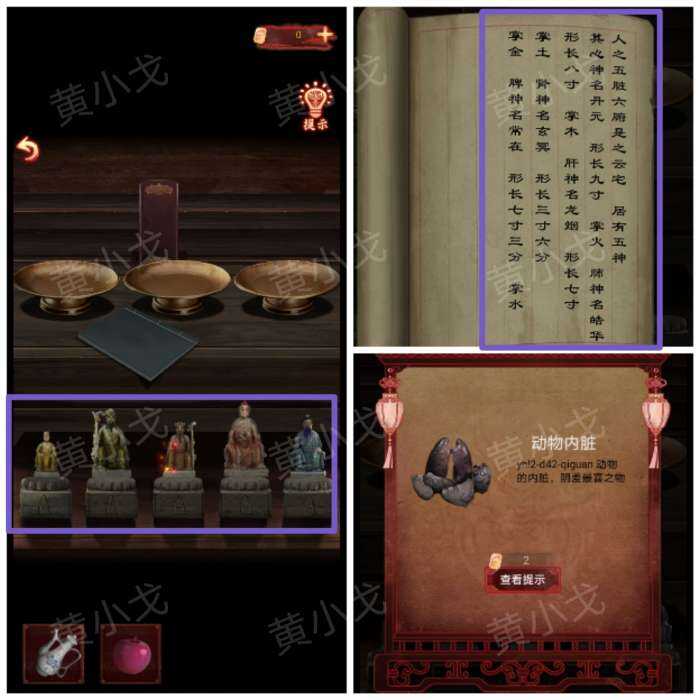 11.根据书上的线索和石盒上的字,调整五神人偶的莅置;打开石盒,获得【动物内脏】
