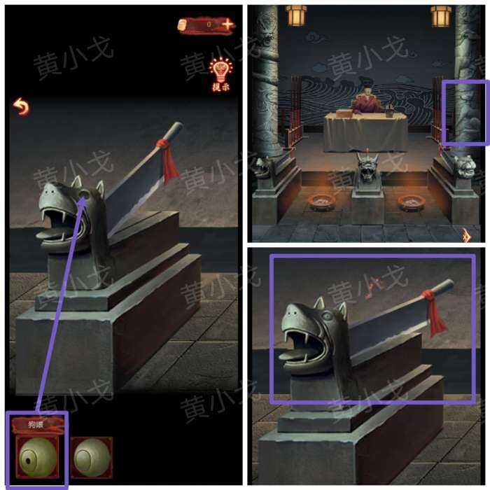 31.点击左侧的狗头铡刀,放入【狗眼】,根据柱子上的图案(an),调整铡刀的角度-平