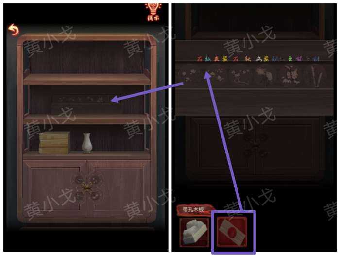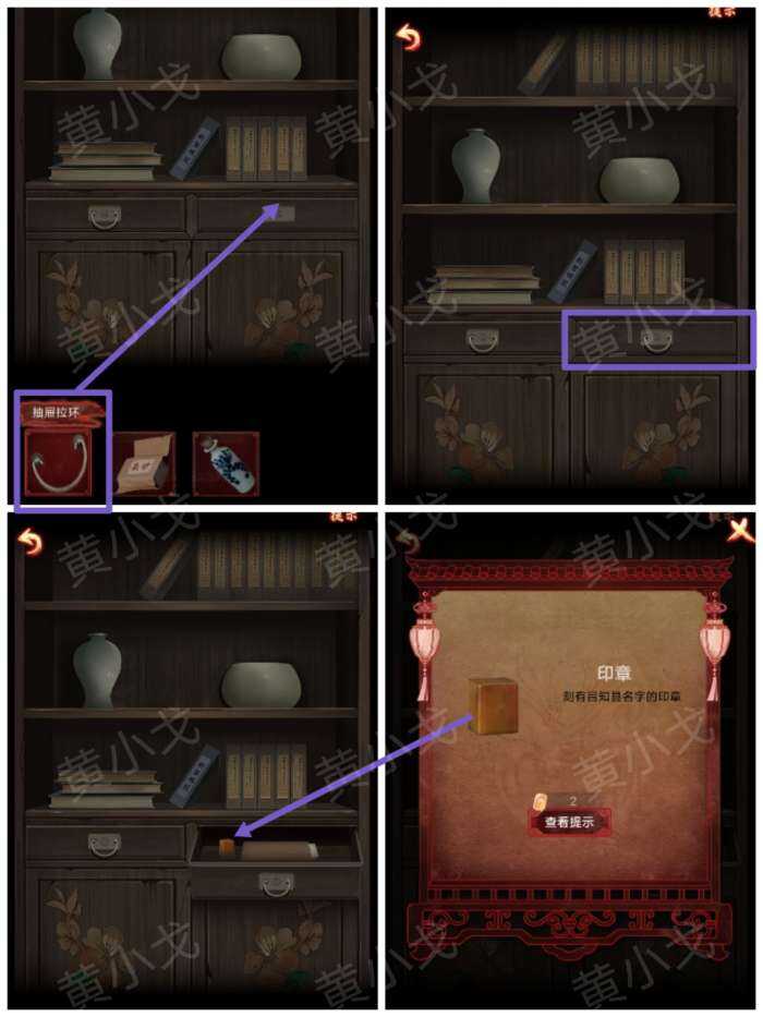 9.点击左侧柜子右边的抽屉,装上【抽屉拉环】,打开抽屉,获得【印章】