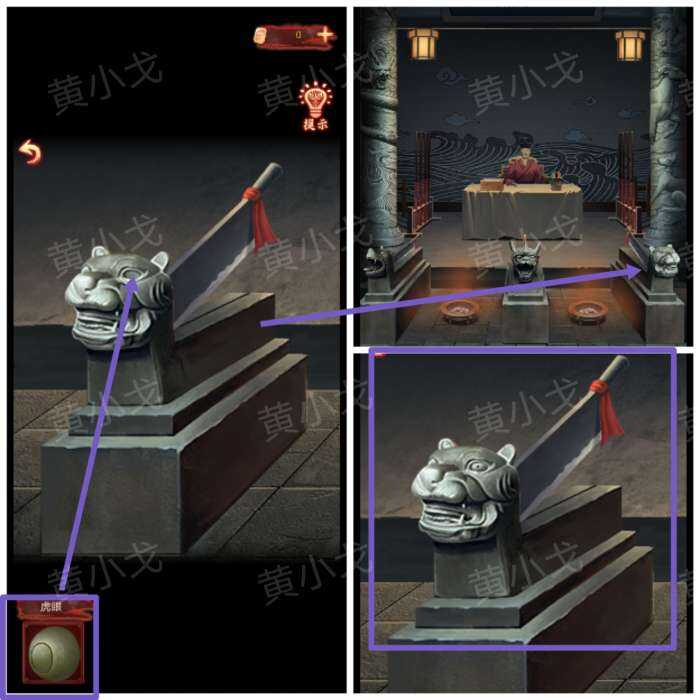 32.点击右侧的虎头铡刀,放入【虎眼】,根据柱子上的图案(an),调整铡刀的角度-斜