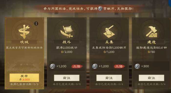 每周可消耗同盟资金,发布3次攻城任务,同盟成员要在限定时间内攻占任务城池,所有参与攻城的成员可获取相应奖励。其次就是战斗、采集、建造任务,这部分很容易达成,完成后可获取贡献币,贡献币可以在民丰坊兑换道具。