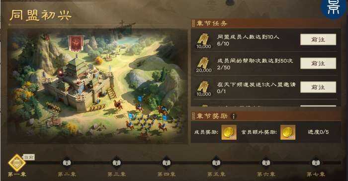 相当于整个同盟的“成长任务”,在完成章节任务后可领取同盟资金,完成对应章节任务可获取金币奖励(如果是官员有额外奖励)。征程任务包括同盟人数、帮助次数、占领城池、同盟技术(jishu)等一系(xi)列(lie)要求,同盟管理者也可注意下相关任务,与同盟成员共同完成任務。除了完成奖励以外,还(huan)能壮大自己的联盟。