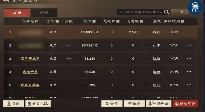 管理:在“成员”界面,可以查看、管理同盟成员(盟主、官员才有权限)。可通过“招贤”在世界发布入盟邀请,每天可以有5次机会;盟主、官员可以在申请列表查看正在申请的成员、战力信息。