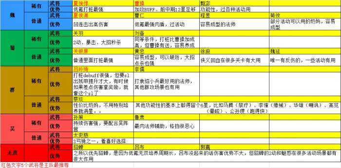 稀有:关羽(2动、暴击、大招秒杀,在很多场景都很有用)、刘备(同等条件,打桩比曹操加成(jiacheng)高,但曹操有送,容易养成)、张飞和赵云PVP的功能大点