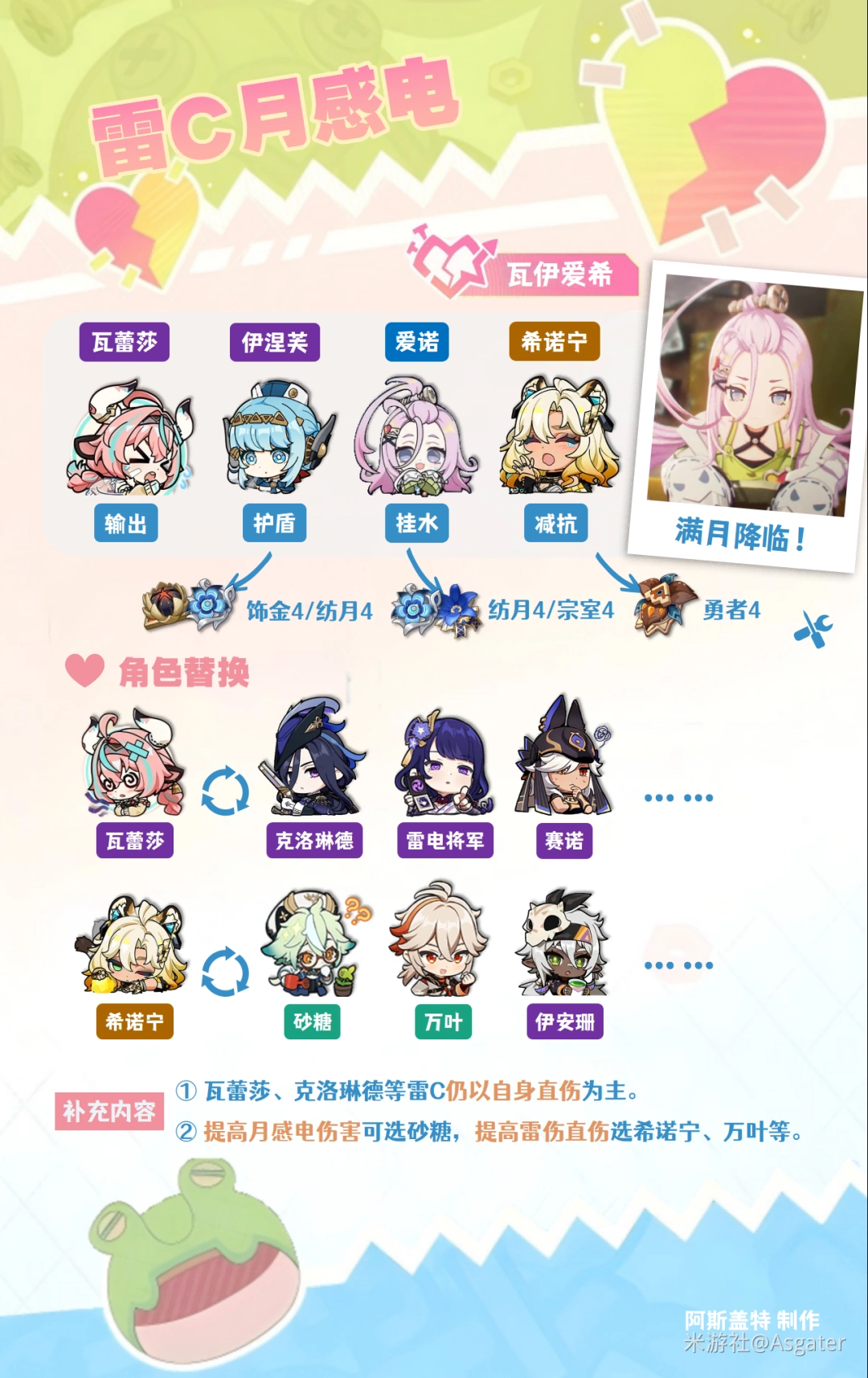 ③ 增益类附着可优选希诺宁、砂糖、万叶,对于上述雷C,仍以自身雷伤直伤为主。