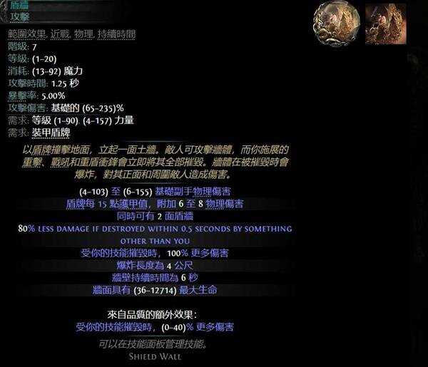 主要依赖盾墙的爆炸伤害,由我们自身触发盾墙爆炸将赋予100%more的伤害。盾墙的伤害分为两段,第一段为近战伤害从地下升起来土墙,对被击中的敌人造成 【近战伤害】,而我们需要的则是第二段伤害,爆炸伤害的增益幅度主要靠【范围伤害】与【攻击伤害】,近战伤害的tag并不加成后续的爆炸伤害,所以我们在词条上需要去找更多的攻击和范围伤害(注:此结论通过youtube和redit论坛上讨论以及作者简易控制变量法自测得出,如有不准确请提出后续论证结果,感谢)。